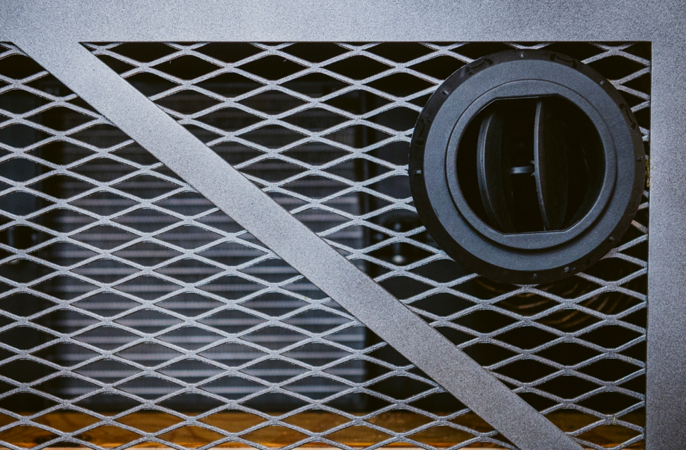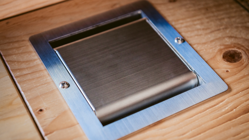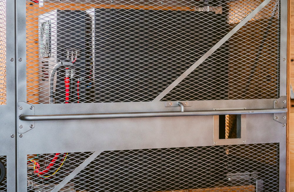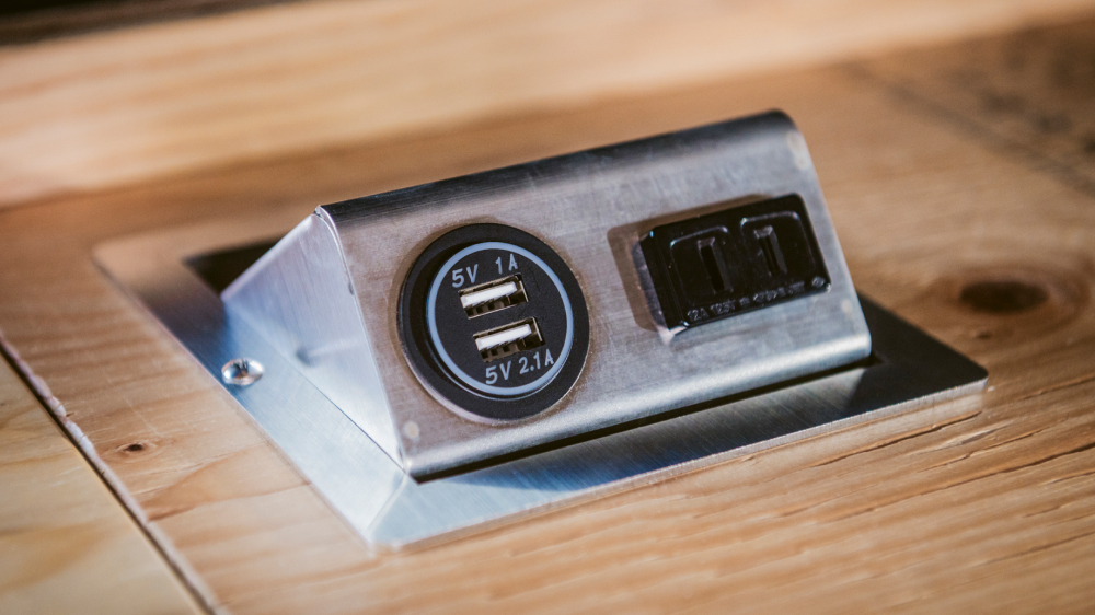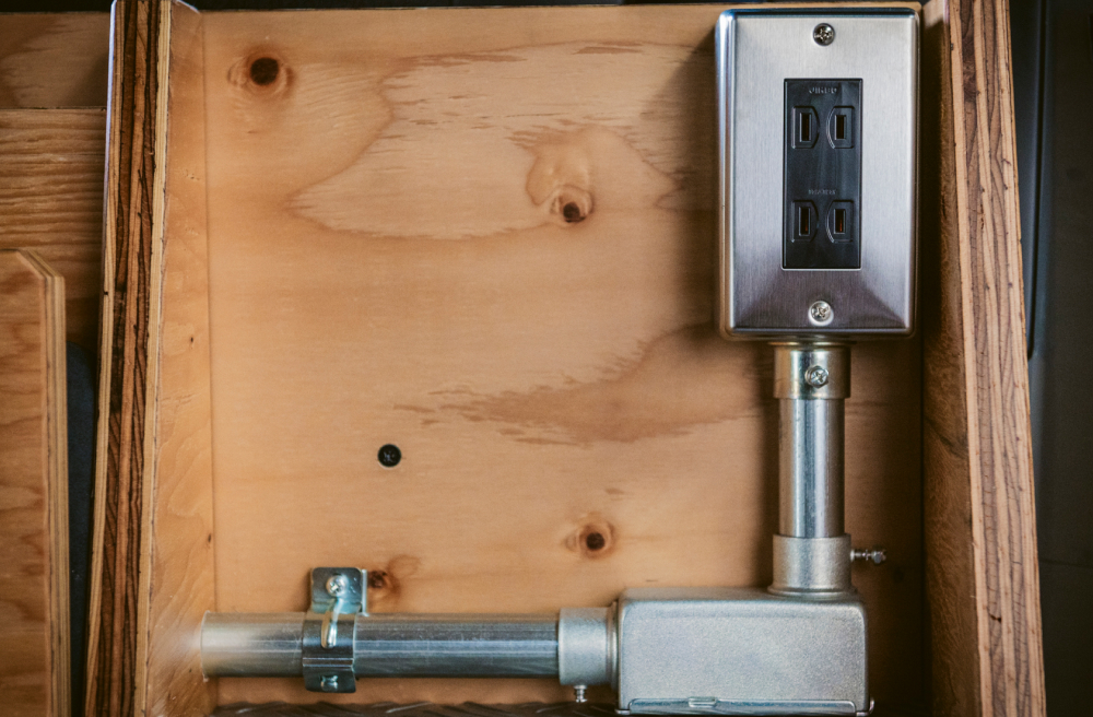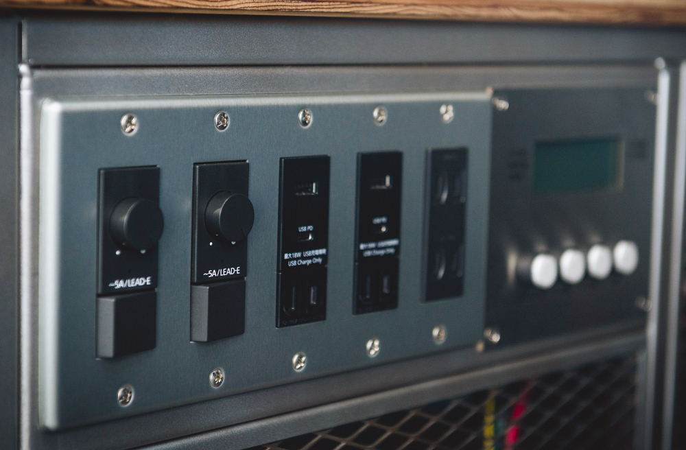 大型バッテリーから電気が供給されるコンセントや調光スイッチにはインダストリアルデザインを採用。 AC100Vコンセント×4 口、USB A×2口、 USB C×2口とパソコンやスマートフォンなどの電子機器に合わせた電源が使えるので仕事はもちろん、 車内で快適に過ごすための家電にも使えます。