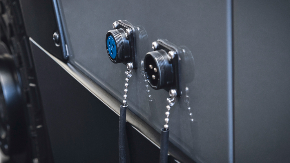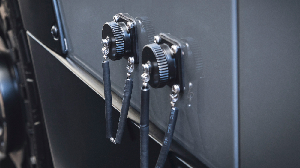 自宅やキャンプ場・RVパークなどで外部電源からリチウムイオンバッテリーシステムに充電することができます、また出力もついているため車外で電化製品を使うときにはここから電源をとることができます。