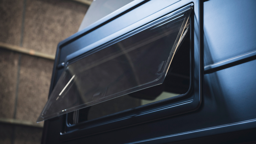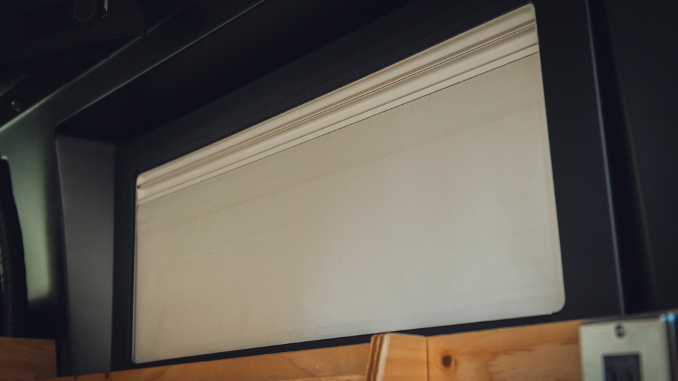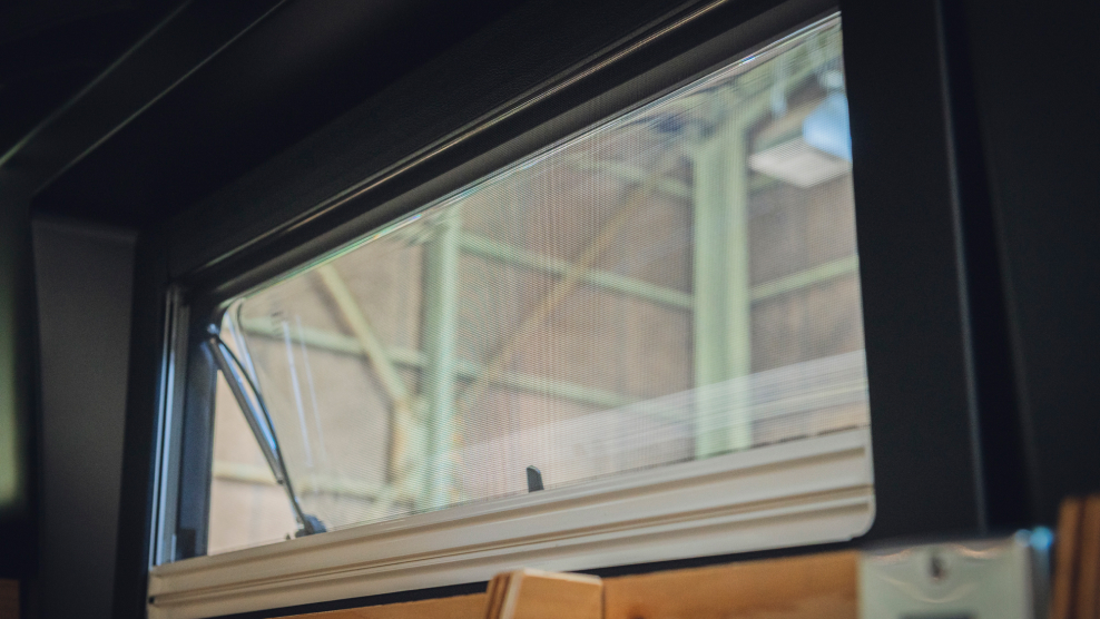 遮光シェードG-01専用に開発された、スクエアなインダストリアルデザインが特徴のベイウインドウ。ベイウインドウの窓にはDometic製のアクリルを使い、換気に便利な網戸、視線を遮る遮光シェードを兼ね備えたスクエアなデザインが車内空間を広くするため、快適なバンライフを送ることができます。