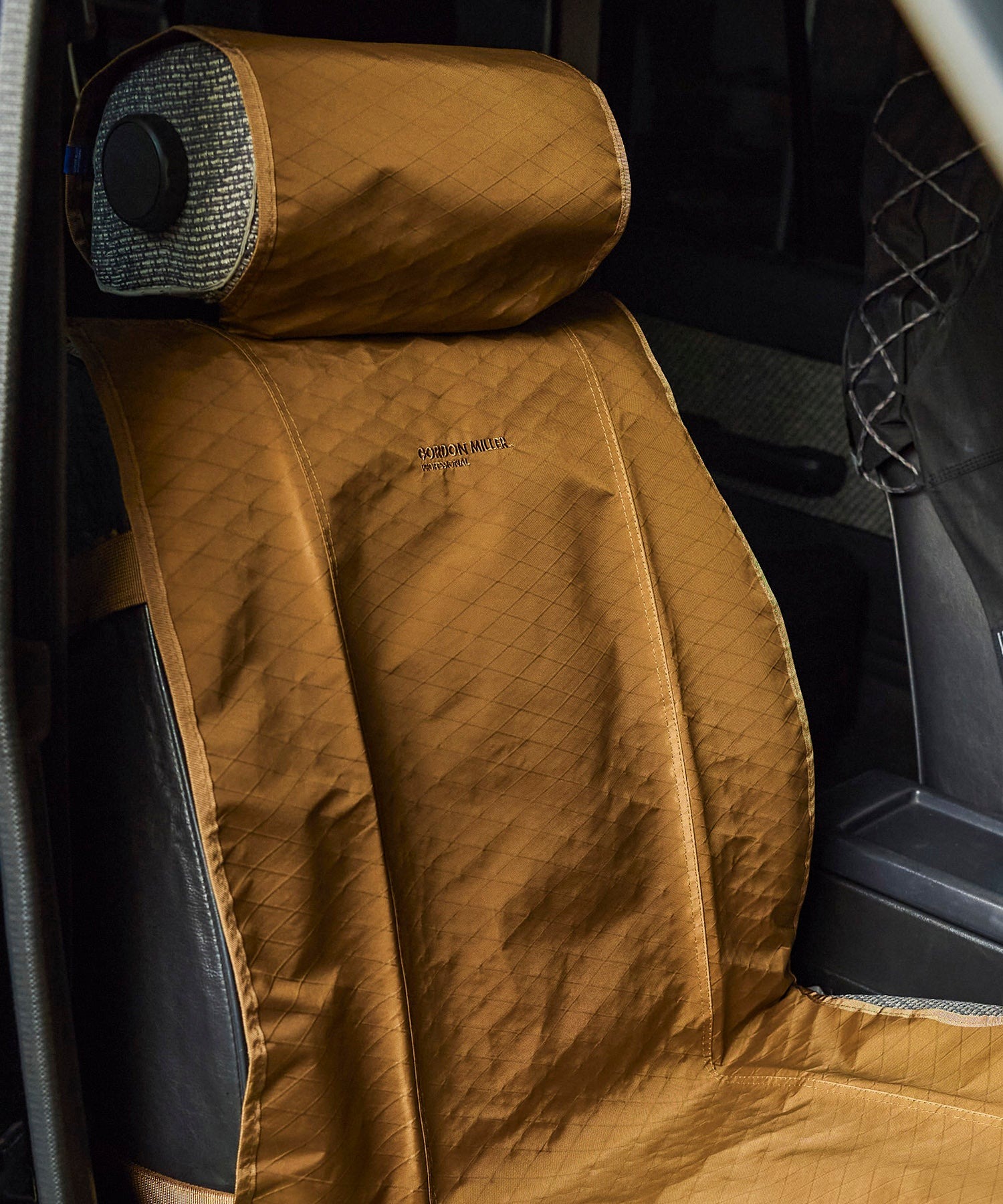 生地には、GRS(Global Recycled Standard)認証を取得したリサイクルコットンを使用した、10号の厚手キャンバスを採用。紡績や縫製工程で廃棄されていた綿の裁断くずや落ちわたを再利用した素材で、環境への配慮とヘビーデューティーな強さを両立しています。キャンバス生地の表面には**パラフィン樹脂(PU加工)**を施し、水や汚れを弾く仕様に。コーヒーのこぼれ、雨の日の濡れた服、アウトドアの汚れなども染み込みにくく、日常からアウトドアまで気兼ねなく使えるシートカバーになっています。ヘッドレスト部分にはモールシステムを採用し、車種によって異なるヘッドレスト位置に合わせて取り付け金具の位置を調整可能。これにより、多くの車種にフィットする高い汎用性を実現しています。さらに、GORDON MILLER MOTORS C-01、V-01の可変リアシートにも対応しており、シートを動かしても干渉しにくい設計です。ヘッドレスト部分には**ベルクロ(面ファスナー)**を装備。お気に入りのワッペンやネームタグを付けて、自分だけのカスタムが楽しめます。実用性だけでなく、ガレージライクな遊び心も備えています。無骨で地厚なキャンバスと、落ち着いたカラーリングにより、ガレージワーク、車中泊、キャンプ、日常使いまで幅広いシーンにマッチ。「汚れを気にせず使えて、しかも見た目がいい」GORDON MILLERらしいヘビーデューティーなシートカバーです。