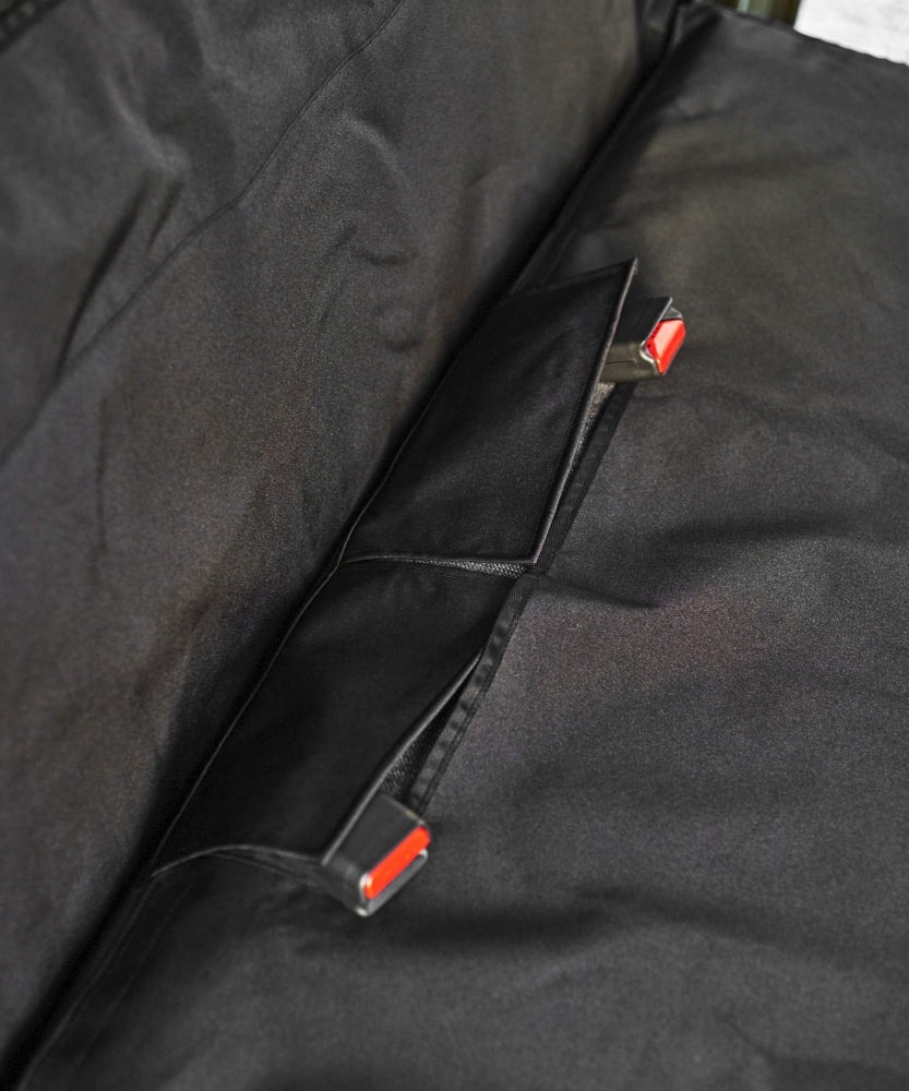 こちらも生地にはパラフィン樹脂(PU加工)を施してあり、水・汚れをしっかり弾く性能に優れています。雨の日の濡れ物、濡れたキャンプギア、泥や砂、飲み物のこぼれなど、ラゲッジスペースの汚れ対策に最適です。ラゲッジスペースに敷いて上部に施されているモールシステムの好きな位置でヘッド部分に止めることが出来るので車種によってたるんでしまったりすることを防げます。工具不要で、車種やラゲッジ形状を問わず使いやすい汎用設計になっています。収納袋もついており、シートを広げているときはポケットとして活用、使わない時は折り畳んでコンパクトに収納可能です。生地がしっかりしており、重厚感があるので付けるだけで高級感がある車内インテリアの完成です。