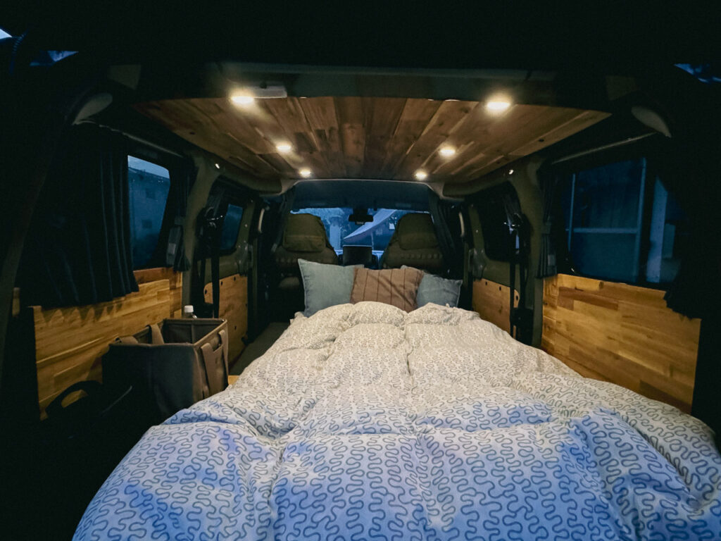夜中、音楽と波の音を思い出しながら帰路に着く。田園の向こうに月が浮かび、秋の気持ちいい風がふいている。車の中にはまだ、波の音と風の匂いが残っている。寝袋やポット、マグカップ。使い慣れたものに囲まれて、どこにいても自分のペースで過ごせた。バンライフカーがあったから、気軽にイベントの前夜祭から参加できた。テントを建てる手間もなく、そのまま眠れる安心があった。イベントや前夜祭、フェスのような時間をもっと気軽に楽しみたい。そんなときこそ、バンライフカーの出番。走る部屋のような安心感が、旅の自由をぐっと広げてくれる。