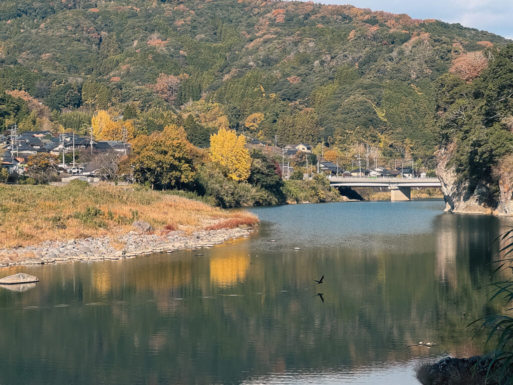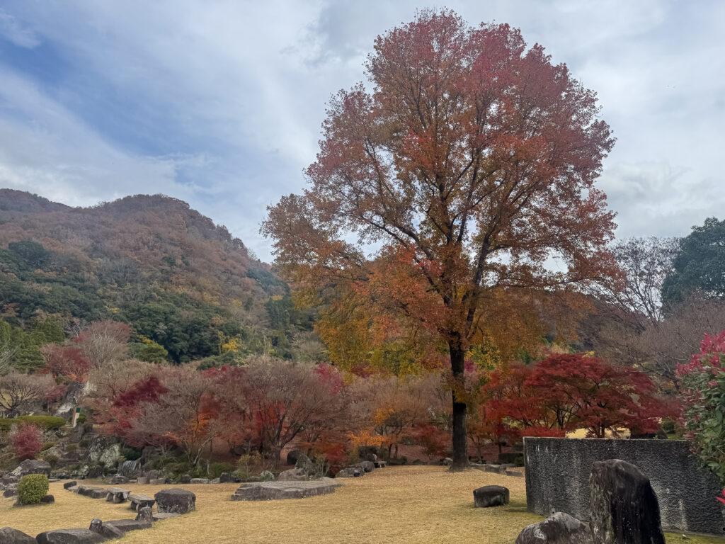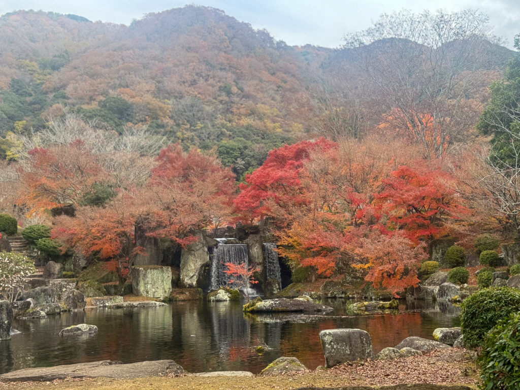 耶馬溪の奥へ進む途中にある日本庭園「渓石園」。池のまわりを木々が囲み、水面に紅葉が映り込む静かな場所。芝生の広場や東屋があり、歩くだけで気分がゆっくり整う。ダイナミックな自然の中に、人の手で丁寧に守られた静けさがある庭園だった。