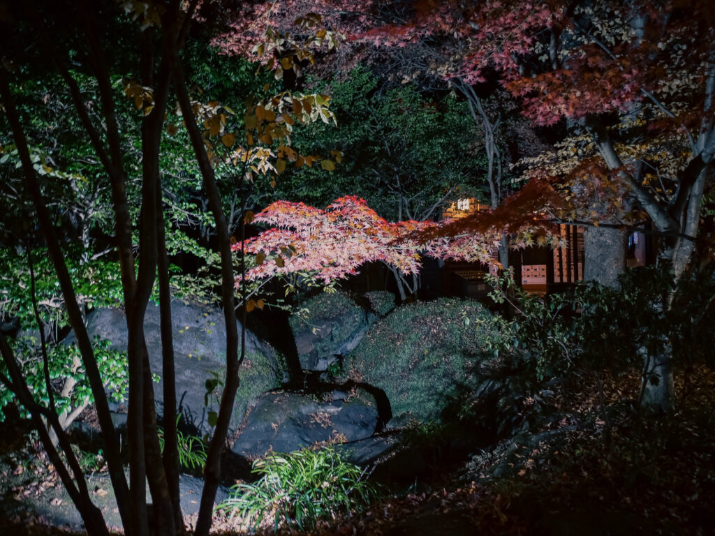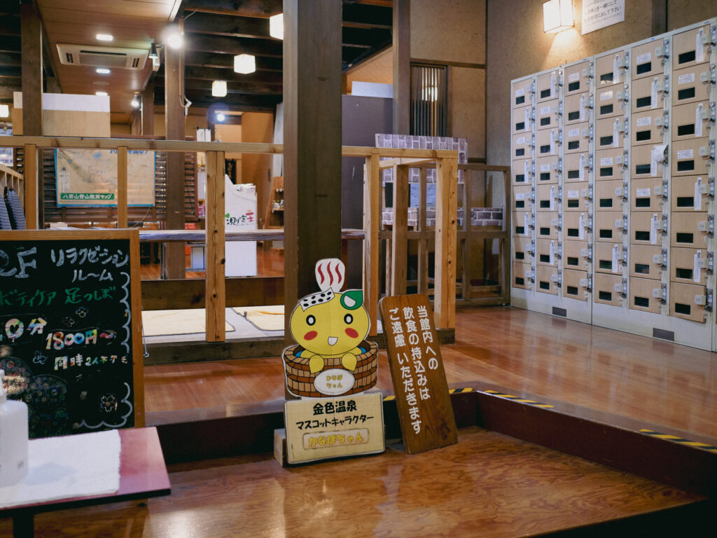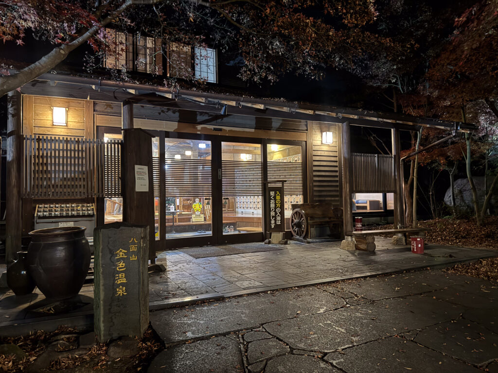 八面山の麓に湧く温泉で、広い露天風呂からは山の稜線がほのかに見える。湯はとろりとした肌ざわりで、冬の冷たい空気にちょうどいい。岩風呂や、庭をめぐる小道があり、お湯に浸かるだけでなく景色の中に身を置くという贅沢さのある温泉。ライトアップされた庭が静かに浮かび上がり、今日見た景色をゆっくり思い返しながら過ごす締めくくりの時間になった。