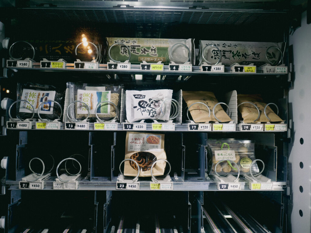 温泉をあとにして向かったのは、谷の入口にある「耶馬トピア」。夜は人も少なく、静かに休んでいる旅の車にもちらほら出会う。広い駐車場の片隅には、地元の蕎麦を使った商品が並ぶ自販機がぽつんと灯っていて、その明かりが夜の山の静けさの中で小さく浮かび上がっていた。広い駐車場に車を停めて外の空気を吸うと、さっきまでまとっていた湯気がすっと引いていくようで、山の夜の冷たさが心地よく感じられた。