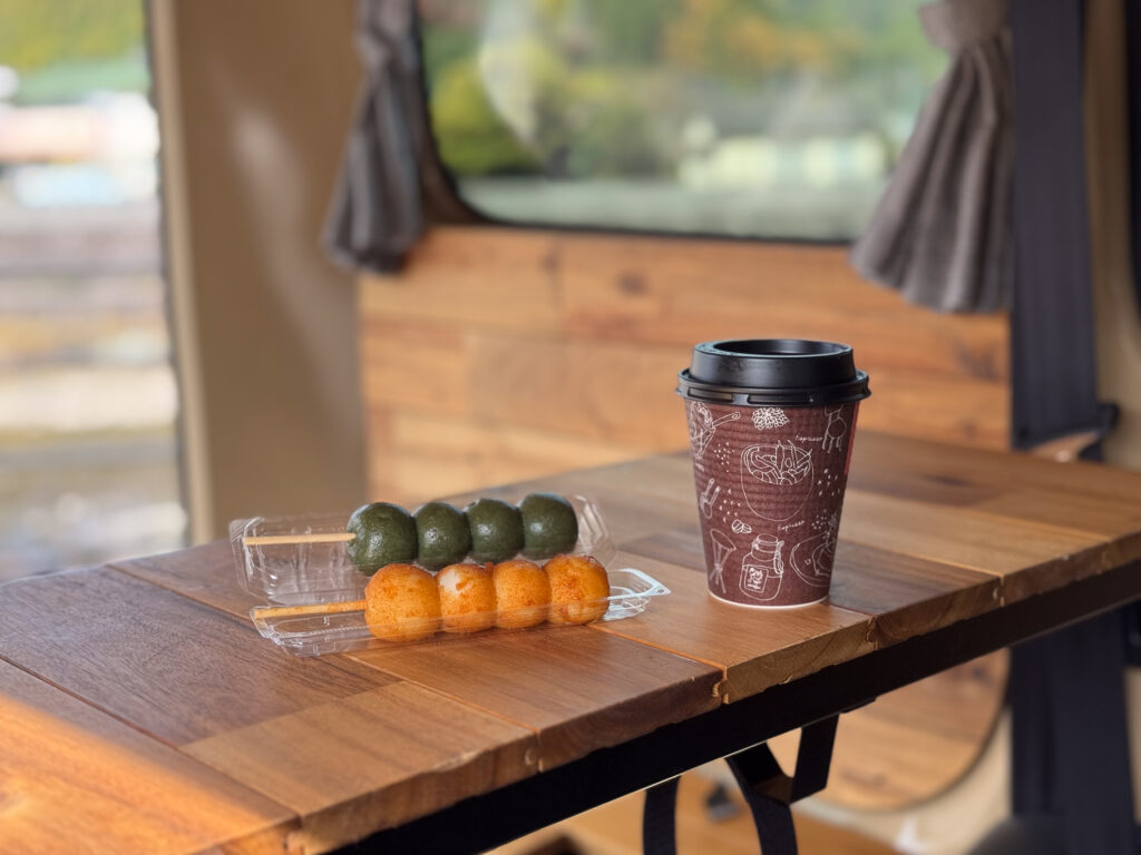 耶馬溪を代表する景勝地「青の洞門」。江戸時代に禅海和尚が30年かけて手掘りした歴史あるトンネル。禅海は諸国巡礼の途中で、鎖渡りでの人馬の遭難を見て人々を救うため、托鉢で資金を集め、30年もの歳月をかけてノミと槌だけで手彫りしたのだそう。断崖が続く道は歩いて景色楽しむことができ、水の流れる音が谷に響いて静かに心地いい。この日は工事中で奥まで行けなかったけれど、行けるところまで歩くだけでも、十分に迫力を感じられる。近くには甘味所があり、団子とコーヒーを買い車内で食べながら景色を眺めた。