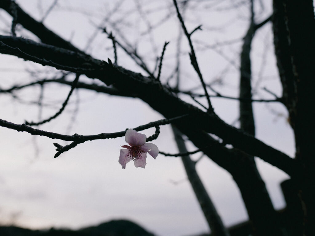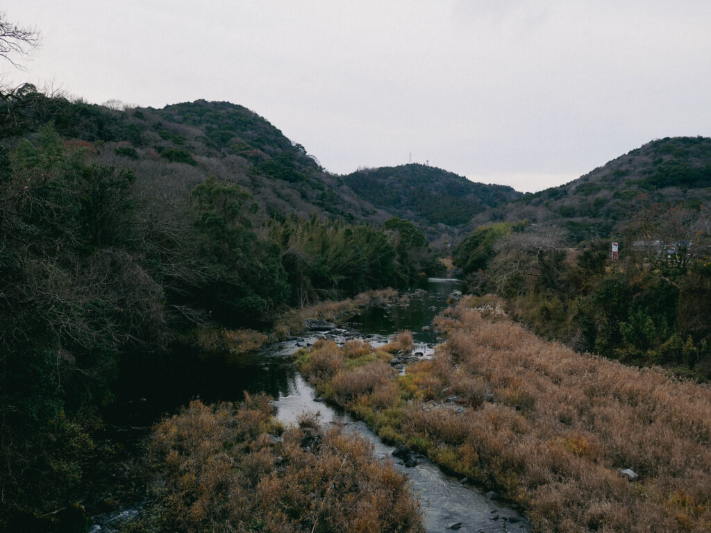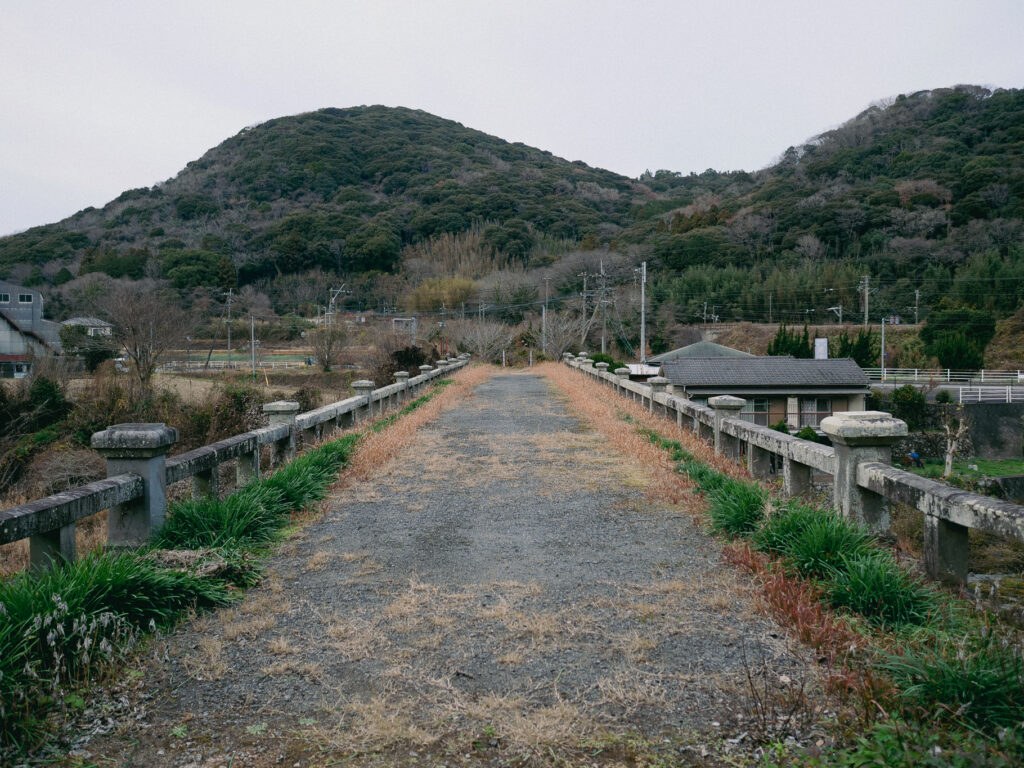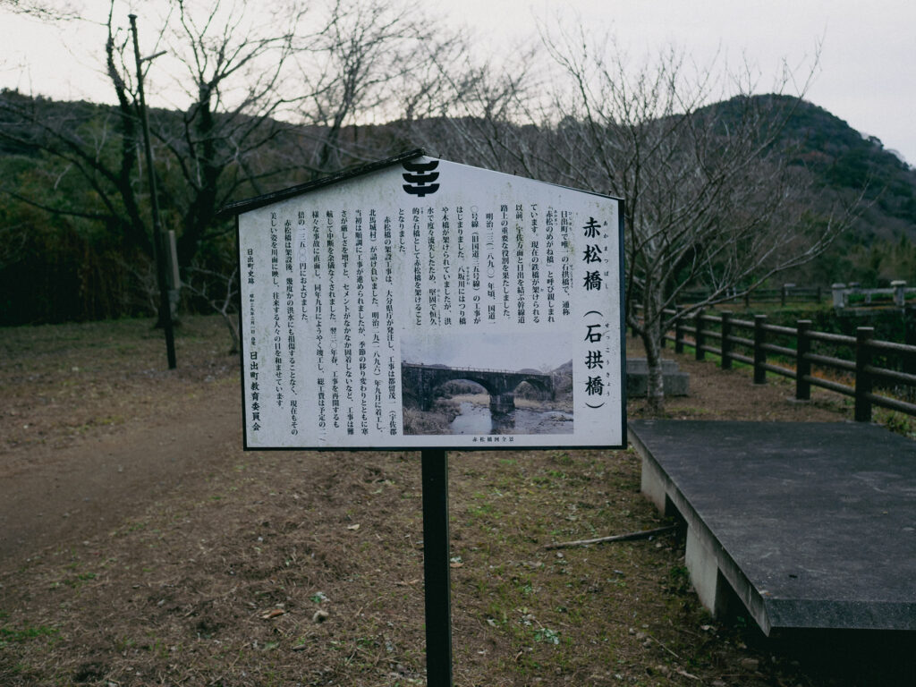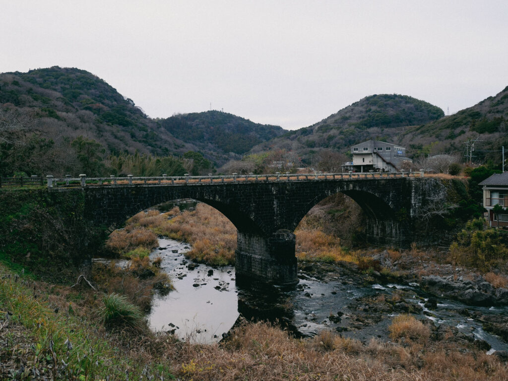 明治時代に架けられた石橋。川をまたぐ二つのアーチと、石を積み上げた素朴な佇まいが、観光地として手入れされすぎておらず、この場所で積み重ねられてきた時間を、そのまま残している。橋のまわりには桜の木が多く植えられていて、冬の景色の中に、ひとつだけ咲いた桜の花が目に留まった。春になれば、この橋のまわりはきっと、まったく違う表情を見せるのだろう。今はまだ落ち着いた冬の色合いの中で、人の営みと、これから訪れる季節の気配が、静かに重なっている。