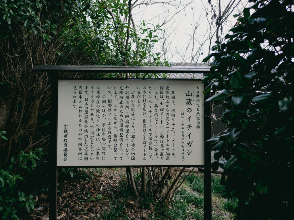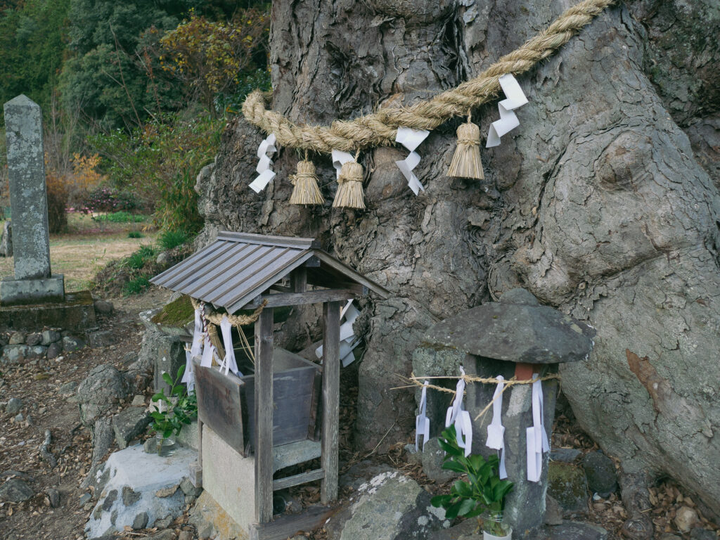 民家の間を抜けた先、「こんなところに?」と思う場所に、大きく聳え立つイチイガシが現れる。看板が立っているので、それを目印に進むと迷うことなく辿り着ける。樹齢は千年を超えるといわれ、地域では信仰の対象として大切にされてきた木。観光地として整えられていない分、この場所が、暮らしの中にある聖域だったことが、より強く伝わってくる。