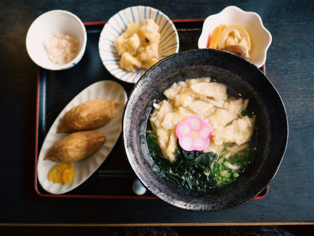 山香の飲食店として親しまれているうどん屋。メニューの種類も多く、座敷があるので子ども連れでも利用しやすい。出汁のやさしい味が体に染みて、冬の外食にはぴったり。写真に写っているのは「おまかせ定食」。個人的にはいなりがとてもおすすめ。GORDON MILLER YAMAGAから、車で5分という立地も嬉しいポイント。