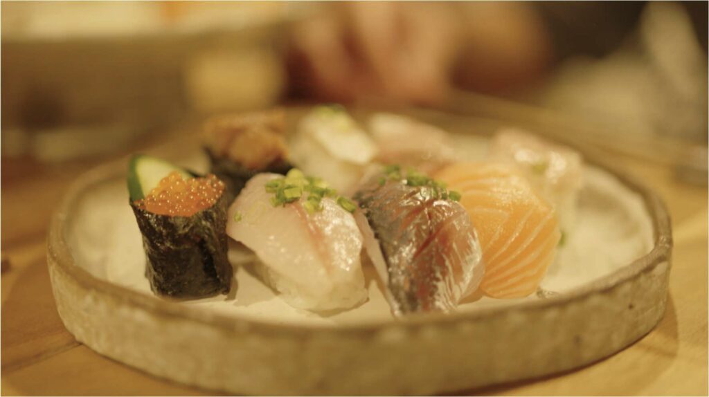 神田楽市で買ったお寿司を盛り付け、スーパーの海鮮丼も、別の器に乗せ替えてみる。器が良いと気分が上がる。