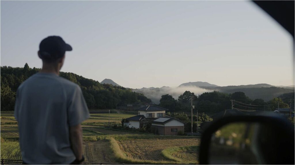 ここで欲が出てきた。田染の朝もやを観たいと。そうと決めたらすぐに出発しよう。ありがとう、粟嶋公園。逆光の朝陽に導かれ、田染荘(たしぶのしょう)に到着。間に合った。旅の最後にどうしても見たくなった景色。国東半島で最高クラスの景色ではないか。早速キャラバン走行してみた。クルマから降りて周辺散策。ここでも虫の音。豊かな自然に心が満たされる。地元のご夫婦が来てくれた。以前立ち寄った際に意気投合して、今では飲み友達に。一緒にコーヒータイム。熟した渋柿を持って差し入れてくれた。驚くほど甘くてジューシー。旅の道中で地元の方と触れ合えるっていいな。てらきちさん、ありがとう。