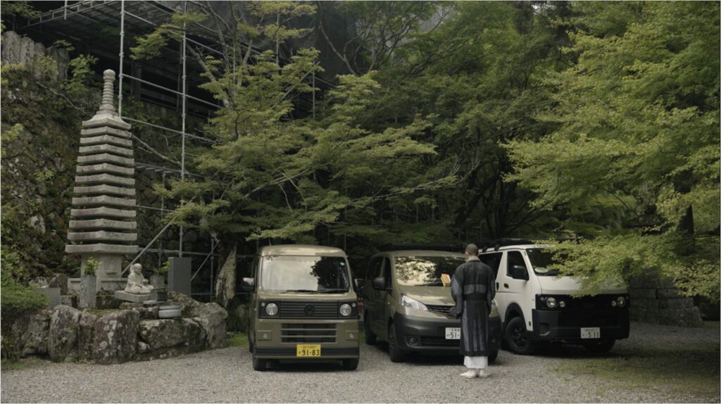カフェを後にしたら、しばらく海岸線を走ってみた。次は内陸方面に向かう。のどかな田園風景を横切り、トンネルを抜け、山岳地帯に入った。小雨が降ってきた。到着したのは、国東半島のほぼ中央に位置する寺院「両子寺(ふたごじ)」。1300 年の歴史があり、瀬戸内海国立公園にも編入されている。GORDON MILLER MOTORS オーナーの交通安全を祈願して、住職にお経を唱えて頂いた。日本全国のオーナーが末永くバンライフを楽しんで頂けることを願う。クルマごと参拝。3車種全て。