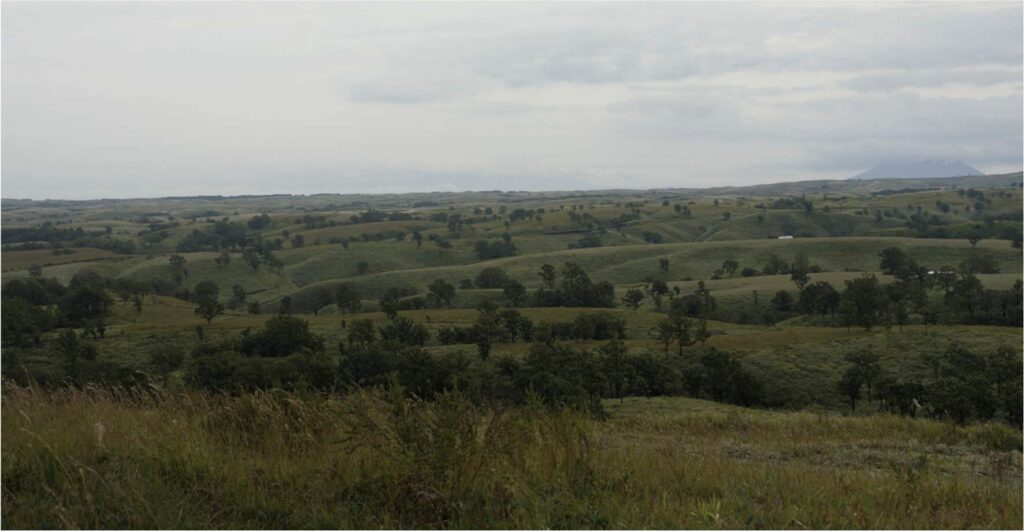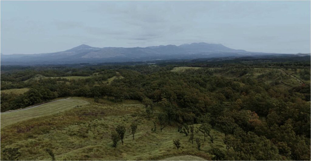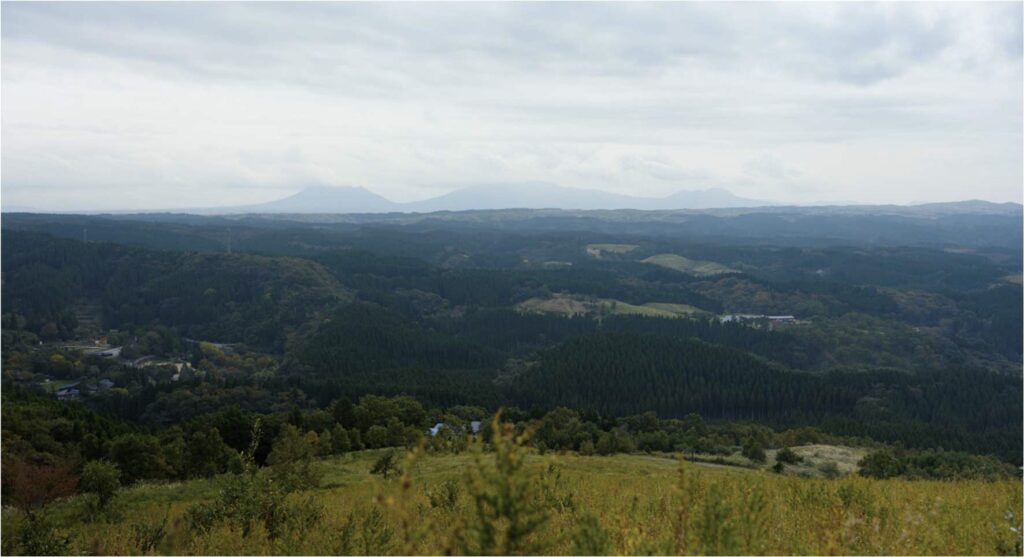 阿蘇の山並みが一望できる。来てよかった。テラスの上の草道を登ると、今日観たいと思っていた通りの、ダイナミックな風景が広がっていた。