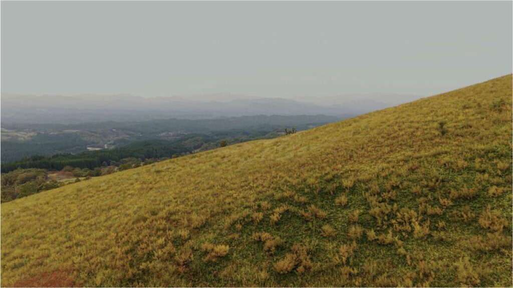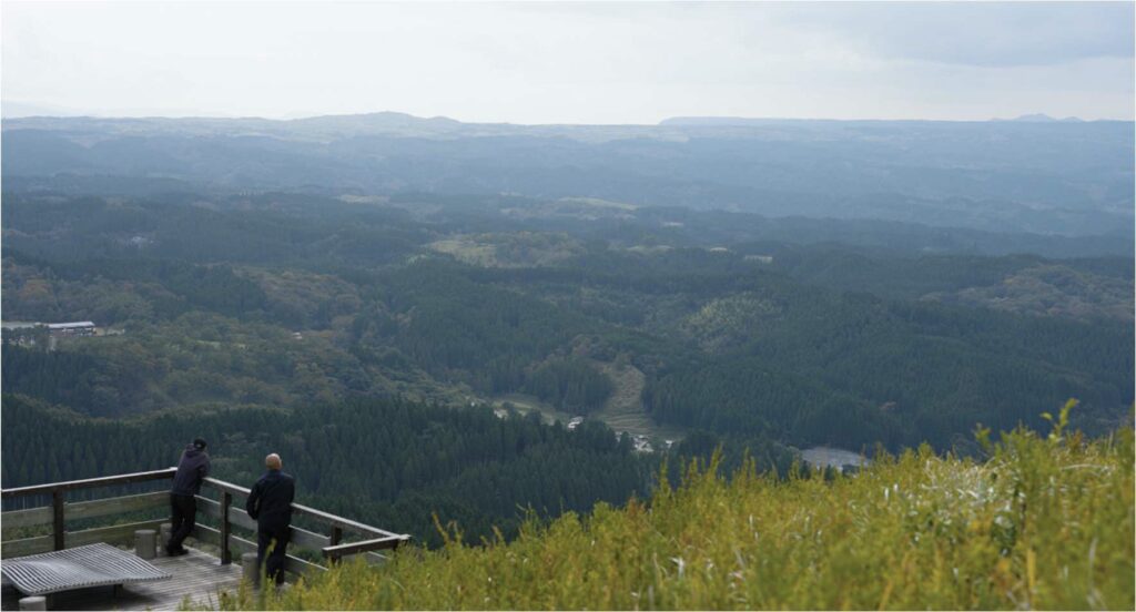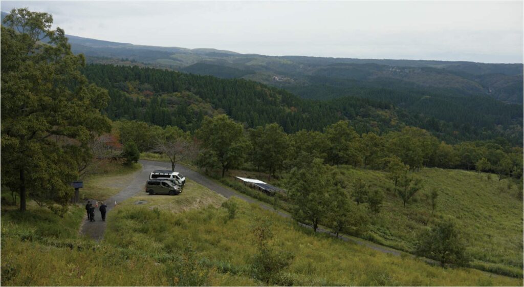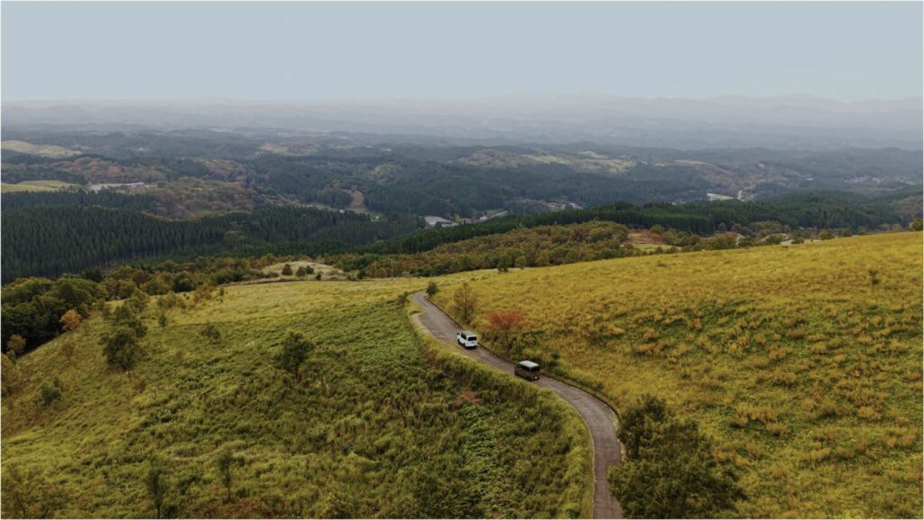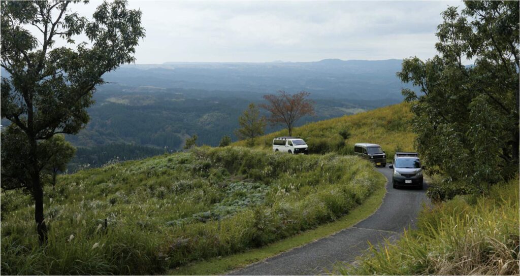 道中、羊に遭遇しながら、一面に広がる草原を抜け、小高い丘の上のテラスへ。次に選んだのは、小萩山草原テラス。押戸石の丘から九重側へ、クルマで30 分。テラスからの景色を想像しながら登っていく。風が、心地良い。