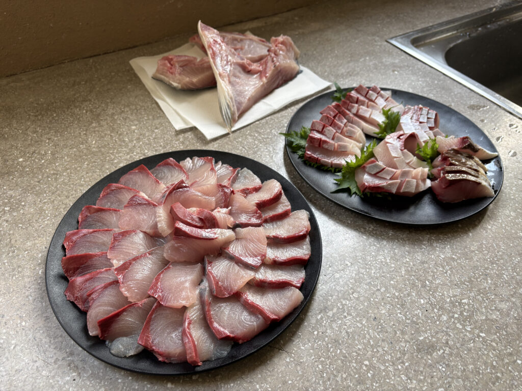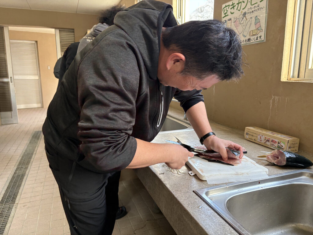 オーナーさんとスタッフの釣り達人が、今日釣った魚を次々に捌いていく。