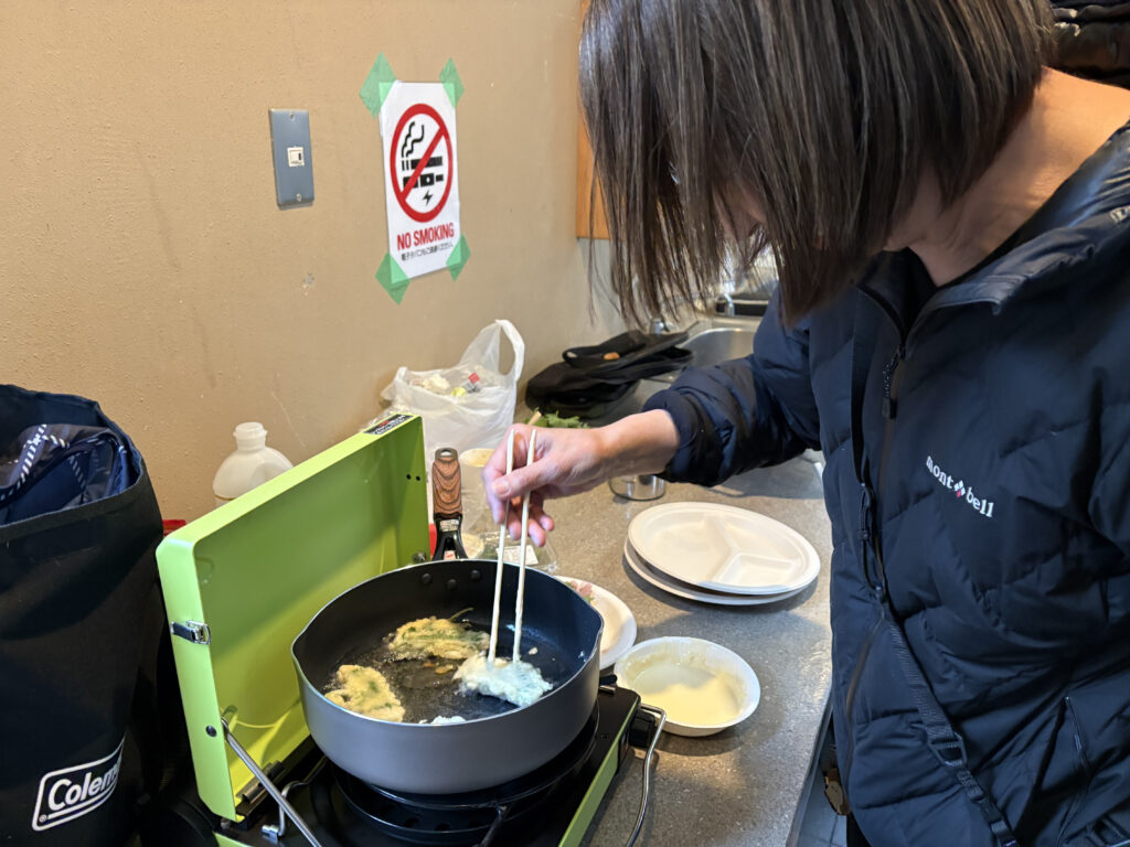 寺谷ご夫妻は、旦那さんが捌いた魚を奥さんが調理していく。味噌と大葉をメジロで挟んだはさみ揚げ。揚げることによって、身がふわふわ食感になる。