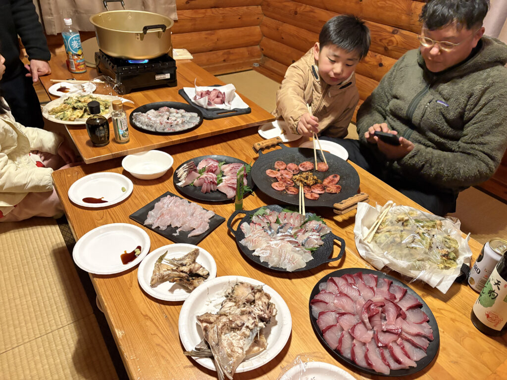 刺身に姿焼き、そしてオーナーのみなさんが持ってきてくださったおつまみ。夕飯が出来上がっていく。