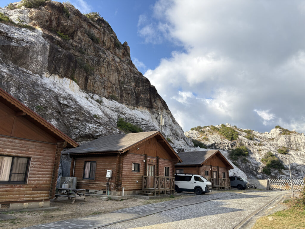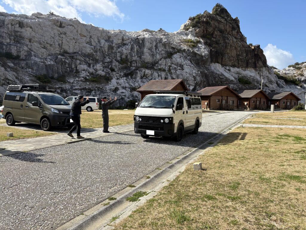 大満足だった海釣りの後は、釣った魚をみんなで食べるために、今夜の車中泊場となる城崎海洋公園オートキャンプ場へ移動。ここは、昨年末に和歌山バンライフの様子を記事にした際にも紹介した白い岩が特徴的な海岸。白い岩とGORDON MILLER MOTORSの車体がよくマッチする。