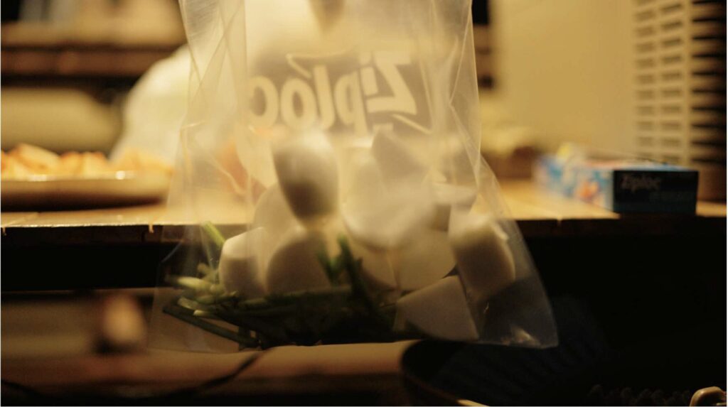 自然薯をすりおろす。あとでスープへ。よく冷えたぶり刺しを取り出し、Ziploc へ。料理酒がないので、美味しい日本酒を投入。少し贅沢だが、火を通さない料理だから、ギリギリ許される気がする。たまり醤油も適量。鹿肉は塩コショウでシンプルに。手作りのフライパンに油を引き、炭火へ。豪快に焼く。側面にも火を入れて、裏返す。燻される香りが、食欲を刺激する。