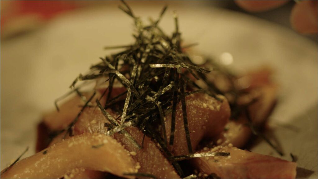 冷やしておいたカブと柿のサラダを盛り付け、ぶり刺しも取り出す。日本酒とたまり醤油がしっかり染みている。そこへ、すりごまと刻み海苔。「ぶり刺しのゴマサバ風」の完成だ。