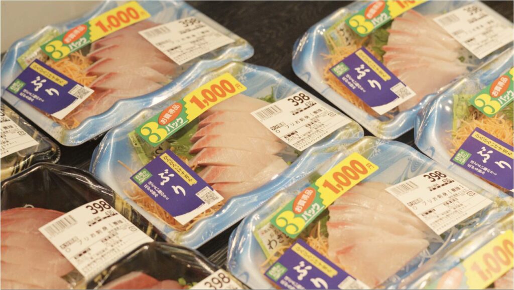 まずは目の前にある、地元スーパー「神田楽市」で買い出し。向かったのは鮮魚コーナー。ぶりが 3 パック 1,000 円とリーズナブルだ。さらに柿も発見。今夜は鹿肉のジビエ BBQ を予定している。