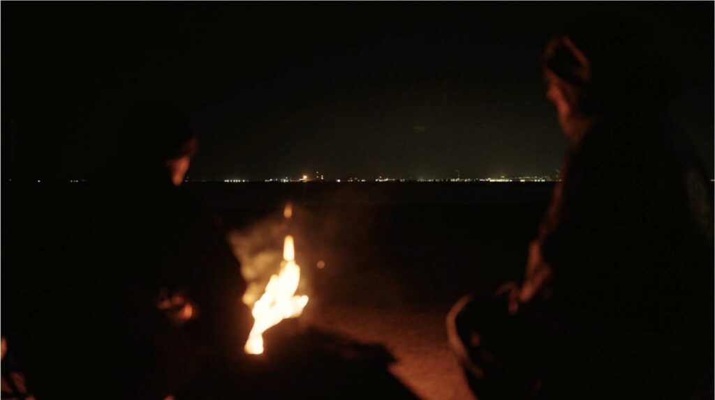 日が暮れる前に、焚き火の準備。地元大分県の町工場が開発した、六角形の焚き火台「山折(やまおり)」。シンプルで武骨。かっこいい。薪は GORDON MILLER ボックスから。今夜はジビエ BBQ と軽く温まるためのライトな焚き火。着火剤は使わず、バーナーで手際よく火を起こす。着火完了。焚き火を囲むのではなく、少しずつ日が暮れていく景色を楽しむ。昼よりも、波音が大きく感じる。