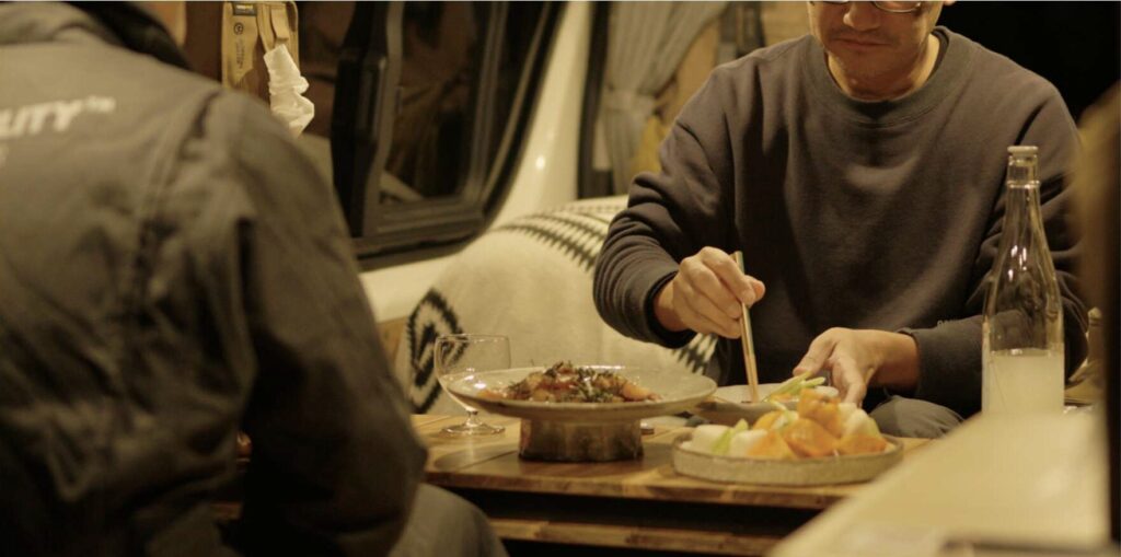 車中飯のスタート。楽しい時間だ。VANLIFE JOURNEY のあり方について、議論も始まる。話は尽きない。気づけば、完全に日が暮れていた。