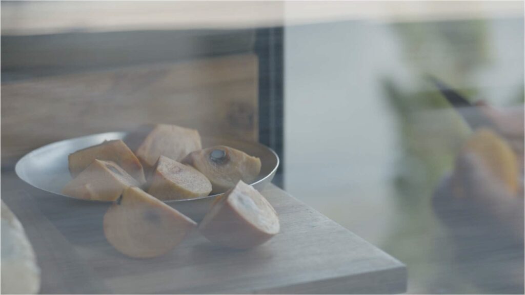 乾杯前のマティーニタイム。残しておいた柿の半分に、レモンを大胆に絞る。前菜代わり。