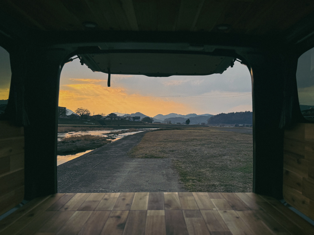 町を抜けて、玖珠川の河川敷へ。水の流れる音と、広がる空。夕暮れの空を堪能する。何もせず、ただそこにいるだけでいいと思える場所。時間が少しゆるむような、そんな感覚になる。車を停めて、少しだけ外に出て深呼吸する。