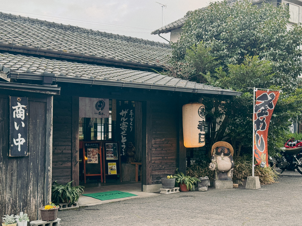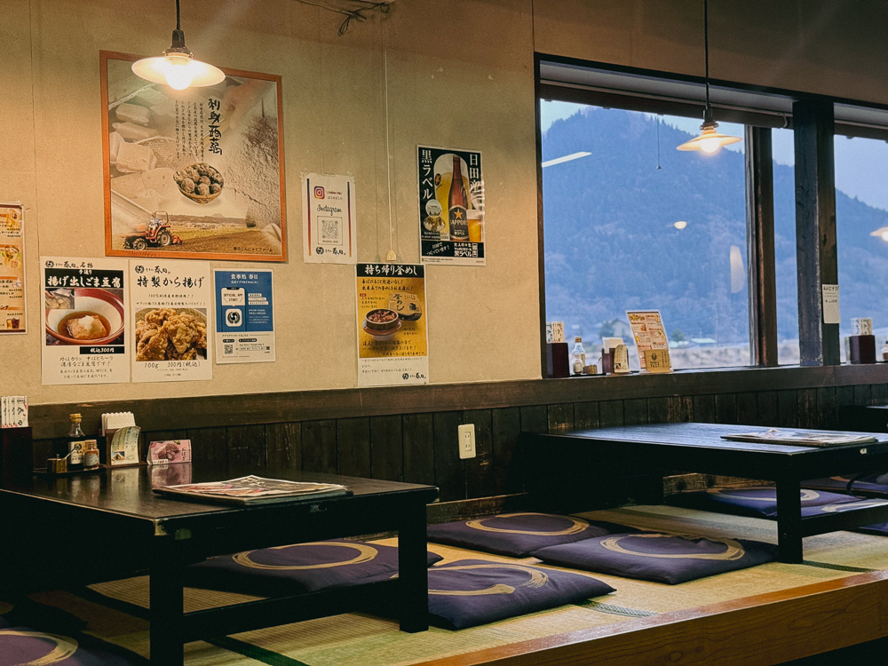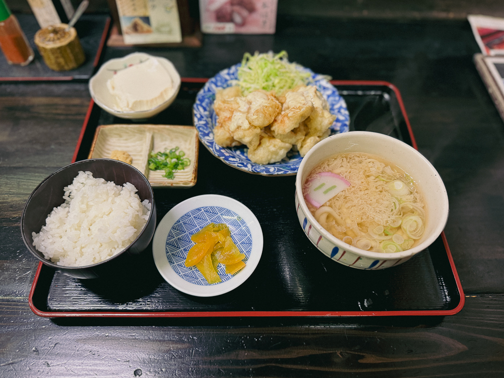 少し遅めの朝食に春日うどんへ。大きな看板のある、昔ながらのうどん屋だ。店内には座敷席があり、窓の向こうには山の景色が見える。うどんに、とり天、ごはん、豆腐がついた定食を頼む。やさしい出汁の味が体に染みる。旅の終わりに、こういう一杯があるとうれしい。