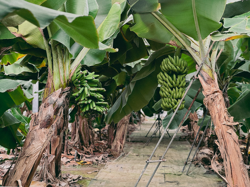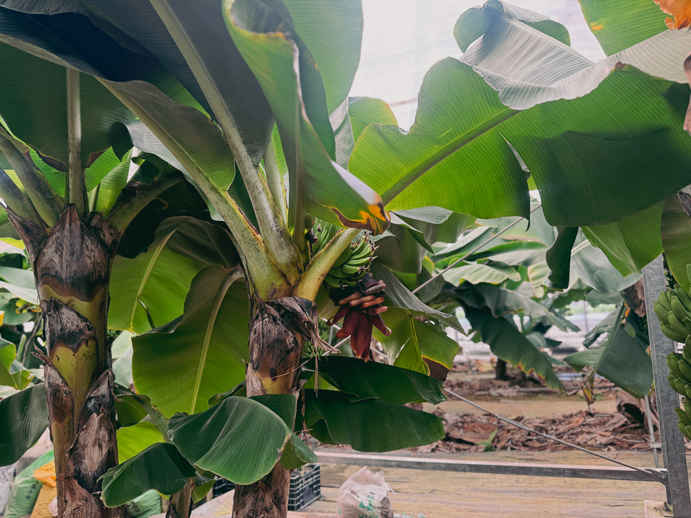 山香を抜けてすぐ立ち寄った菅原農園。大分県杵築市山香町の山あいで、季節の野菜や果物を育てる農園だ。安心して食べられるものを届けたいという思いから、農薬や化学肥料を使わず、国産バナナの栽培にも挑戦している。今は、直売やカフェ、体験がゆるやかにつながる場所づくりも進めているという。