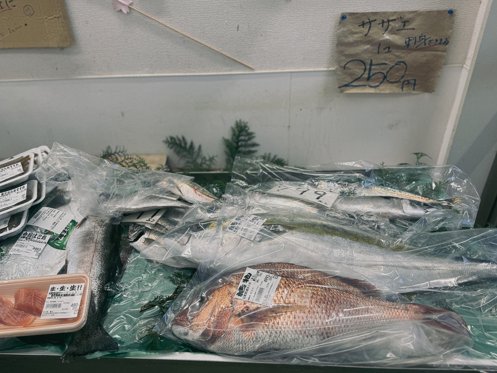 町の中で見つけた魚屋に立ち寄る。派手さはないが、地元の空気がそのまま残っているような場所。次々に地元の人が訪れる。こういう店に出会うと、その土地の暮らしが少しだけ見える気がする。