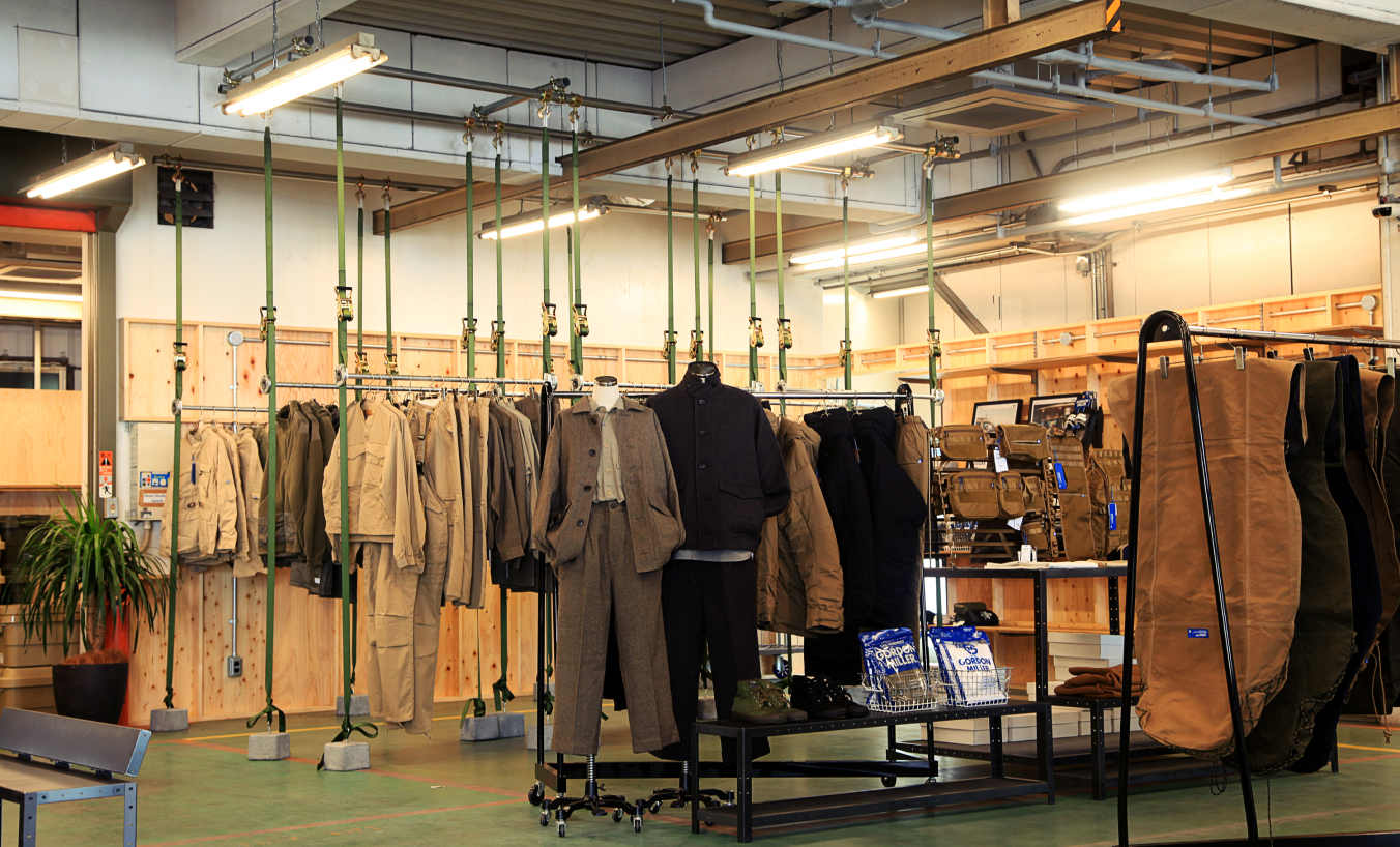 店舗は東京・蔵前駅から徒歩数分、大通りからひとつ入った路地に位置し、過去は船舶エンジン関連の工場だった物件を活用した百数十坪の広々とした空間になっています。工場らしいディテールを活かしながら共通の素材を用いて手を加え、一部には同じ蔵前エリアのメタリック家具メーカー「MILLS」にオーダーした什器も使用しています。さまざまなカテゴリーの商品や車両、商談や談話のためのスペースやメンテナンスピットが同じ空間にひとまとまりになっており、ブランドが持つシームレスなジャンルの横断を感じていただけます。